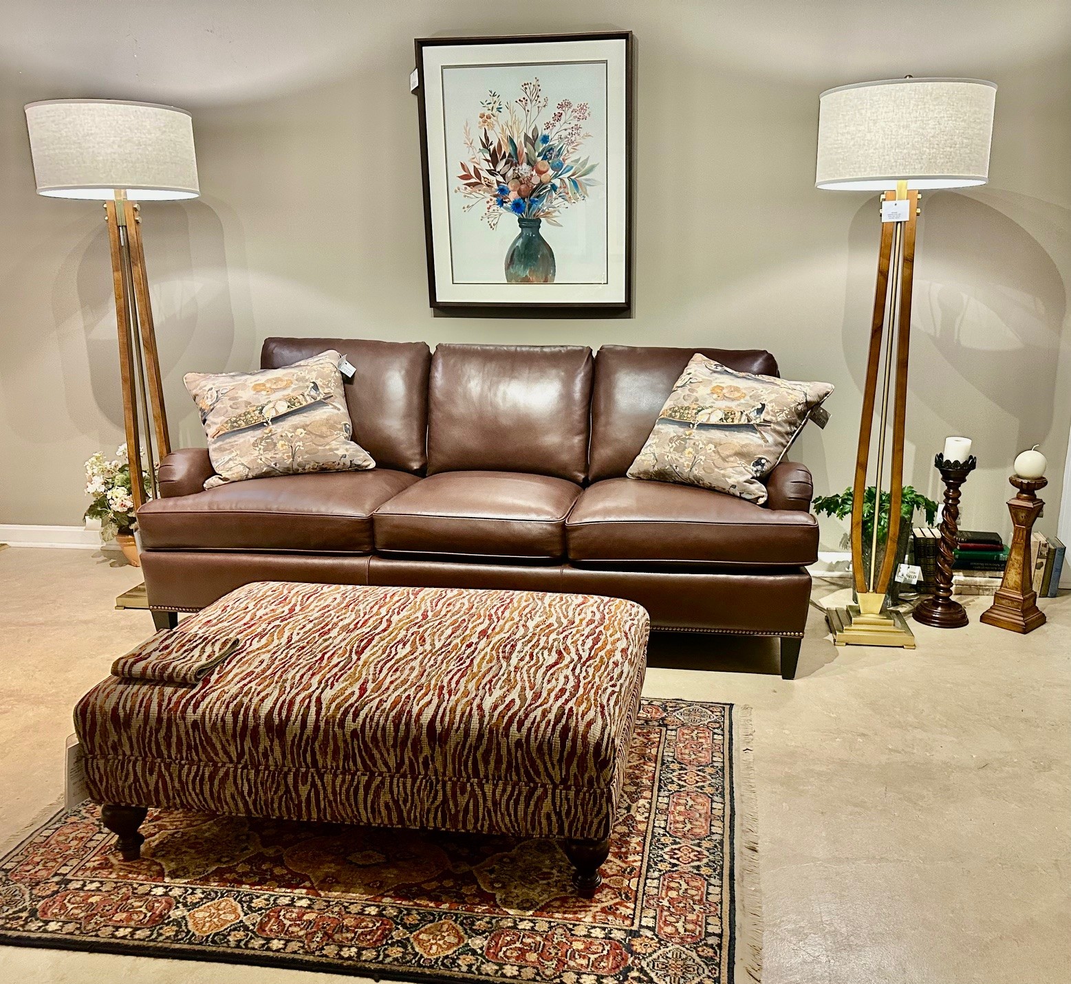 Premium American-made leather sofa, handcrafted by skilled artisans. Each piece is meticulously tailored by specialists with years of experience. This sofa will provide comfort and durability for many years to come. The accented leather ottomans likely bring in a sense of luxury and durability, while the carved chair adds a touch of craftsmanship and vintage charm. Mixing a print with solid fabric brings a dynamic balance to the design—one that feels both classic and contemporary.