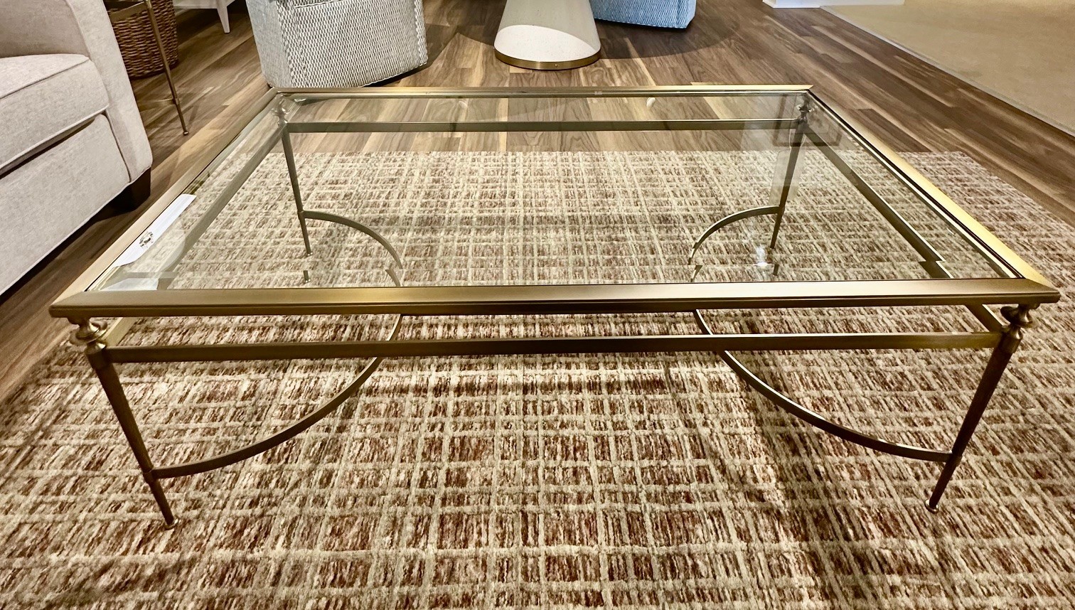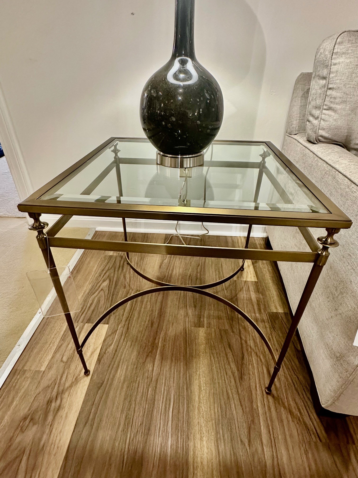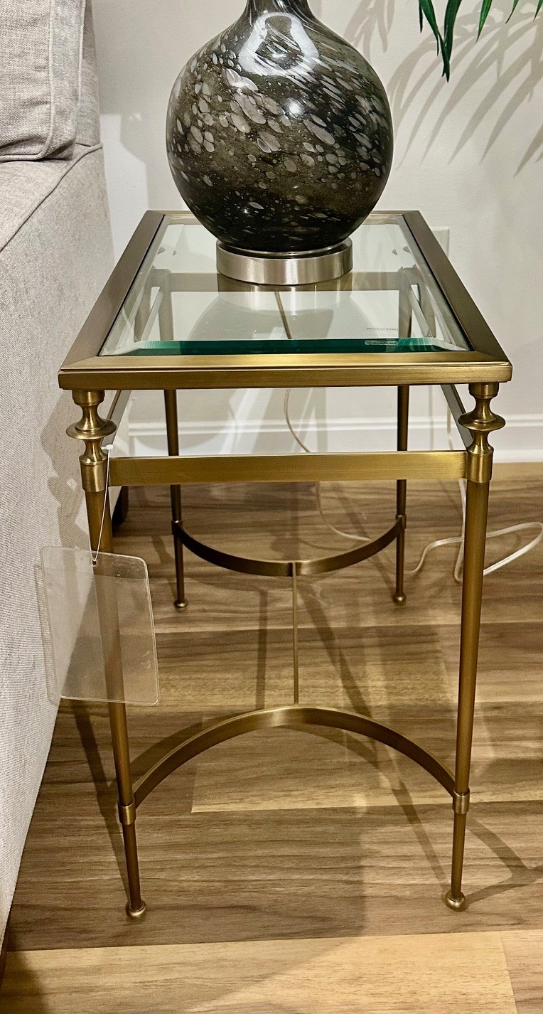 Take a look at these stunning tables that feature a stainless steel base, a beveled glass top, and a brushed brass finish. Perfect for your living room.