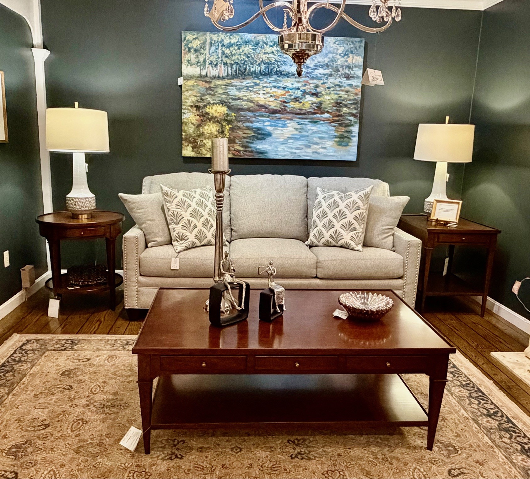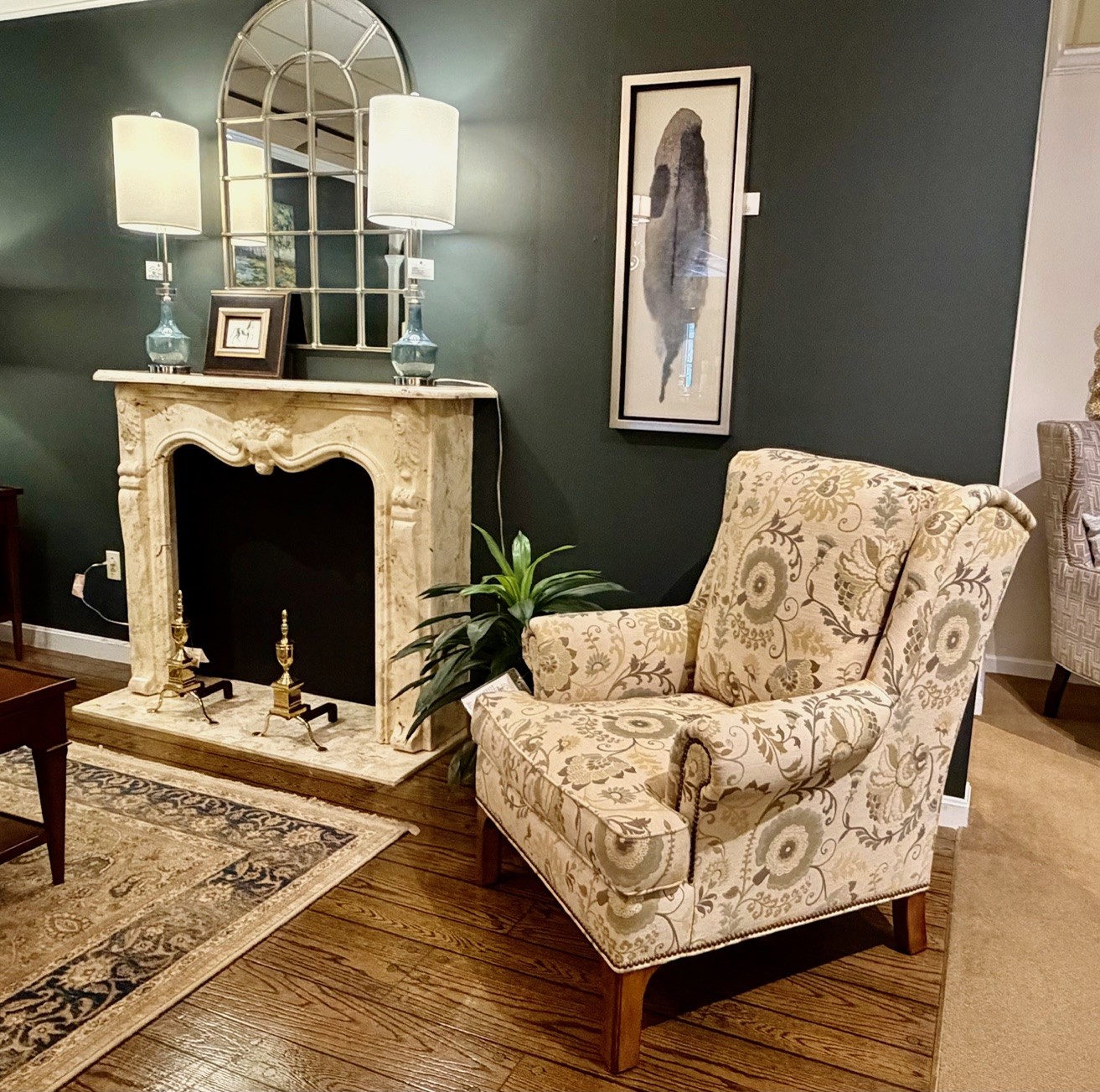 This chair and ottoman make for today’s relaxed look, a perfect area to read a good mystery.